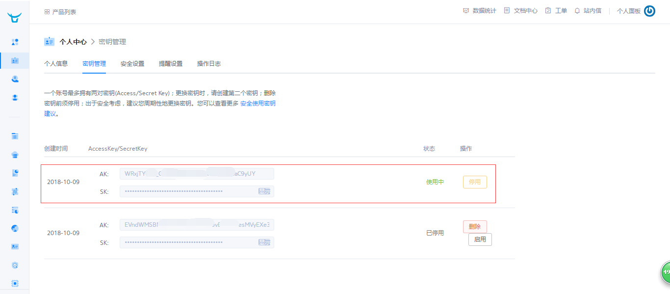 4.1 上图的AccessKey和SecretKey在七牛云的“个人面板”—“密钥管理”就可以获取(这里有两个,选择其一即可)
